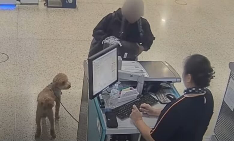 Airline staff informed her she could not board the dog without proper documentation. Surveillance footage later released by police allegedly shows the woman tying the leash to a metal carry-on baggage sizer near the counter before walking toward her gate.
