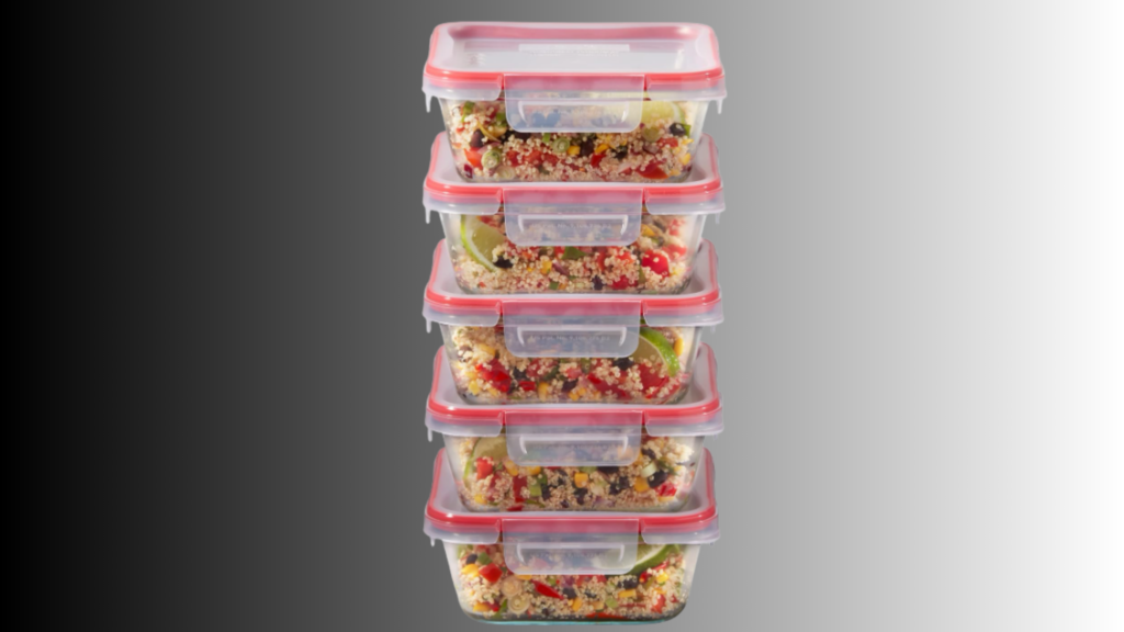 Glass containers with locking lids are preferred for fresh foods because they don’t absorb oils or odors. Pyrex Freshlocks Glass Food Storage Containers are an example of airtight and leakproof locking lids in BPA-free containers.